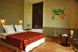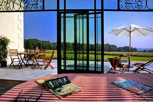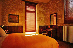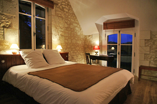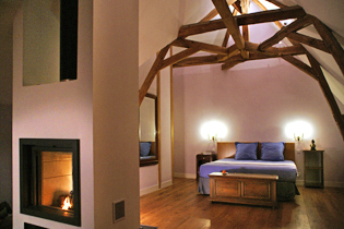 La suite de l'étang: trois portes-fenêtres offrant trois points de vue différents sur le domaine ; lit de 2 m ; salle de bains et WC séparés ; salon ; cheminée double face ; terrasse privative.